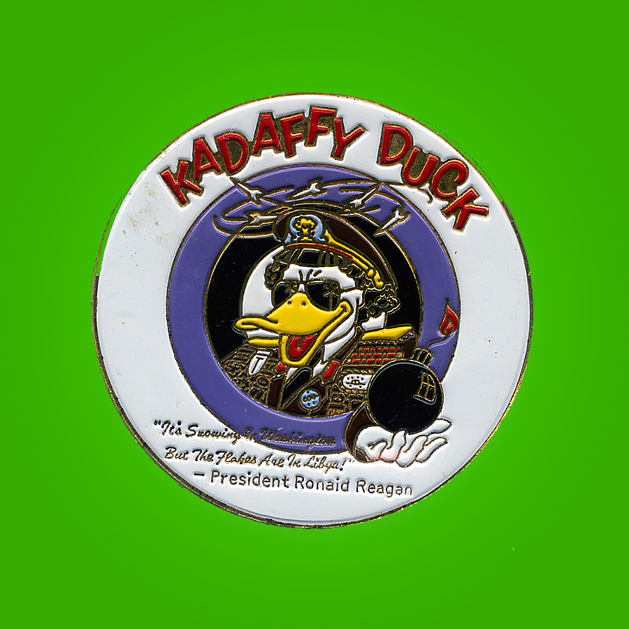 TSG purchased this now-topical political pin from a co-worker back in 1986. We are unsure of the provenance of the graphic; a brief google session finds a couple other instances of it on T-shirts. One particular website features a tan shirt with this logo being worn by a rather attractive brunette model. Upon closer inspection (of the t-shirt, not the model), we can see additional text: LOONY LEADERS OF THE WORLD NO. 1 / ©1986 JRD ENTERPRISES